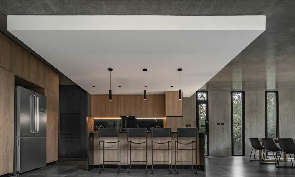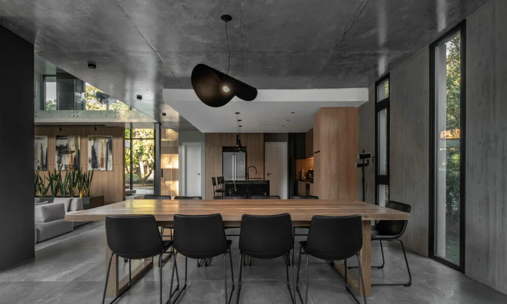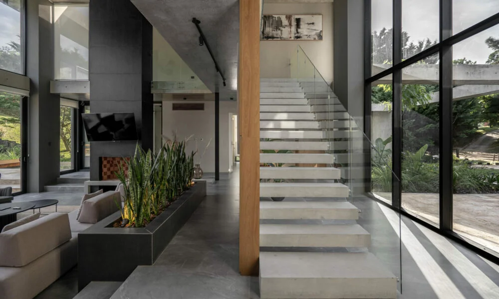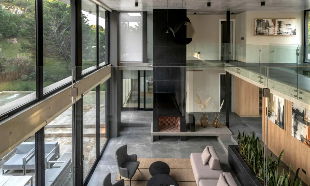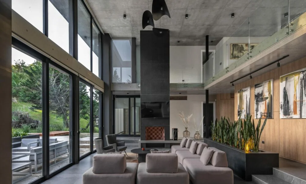 El hormigón visto es el material predominante en la fachada, pero en el interior se combina con otros elementos como la madera y el acero negro, creando una atmósfera cálida y acogedora. Los grandes ventanales de piso a techo permiten disfrutar de vistas panorámicas y llenan los espacios de luz natural.