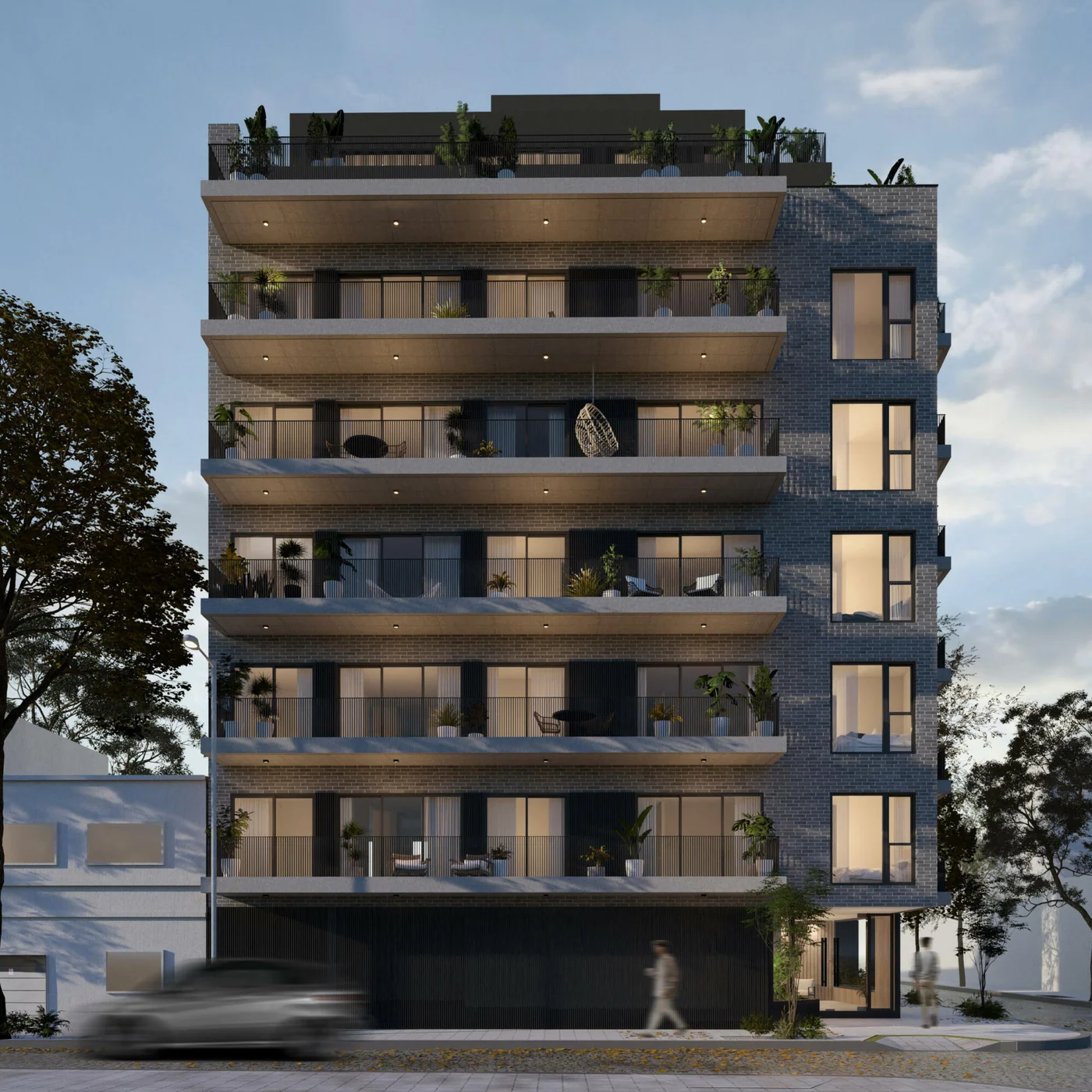 El proyecto se desarrolla sobre un terreno de 252 m² y alcanza una superficie total de 2.203 m². Cuenta con 23 unidades de entre 46 y 132 m², distribuidas en planta baja y siete pisos, lo que refuerza su escala selecta.