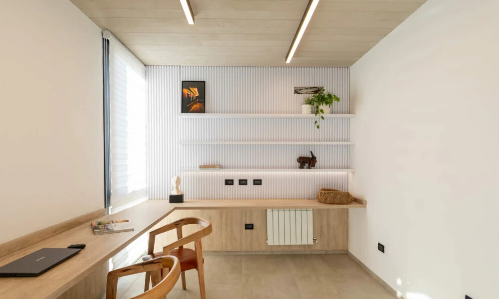 Otra característica destacada es la incorporación de un home office con entrada independiente desde la fachada. Este espacio, concebido para responder a las demandas de la era post-pandemia, permite recibir visitas laborales sin interferir con la privacidad de los demás integrantes de la familia. Este enfoque hacia la independencia funcional refuerza la versatilidad del diseño.