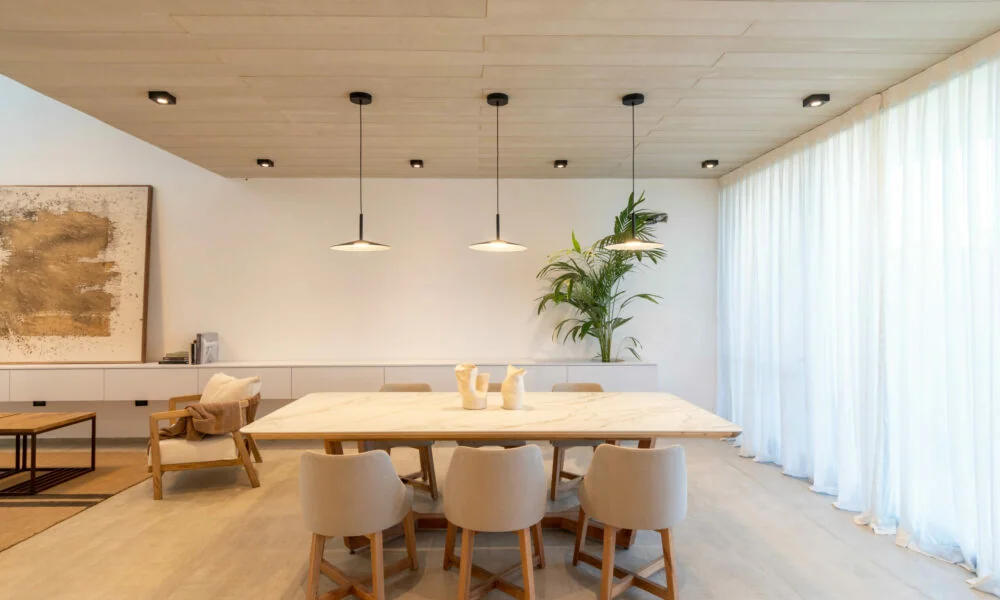 El núcleo de la Casa Buso es su cocina-comedor y el estar, diseñados bajo un concepto abierto que fomenta la convivencia y la interacción. Este espacio central se caracteriza por una doble altura que acentúa la sensación de amplitud y luminosidad. Las grandes ventanas de pared a pared permiten que la luz natural inunde el área, creando un ambiente cálido y acogedor ideal para reuniones familiares y sociales.