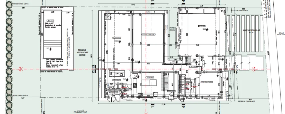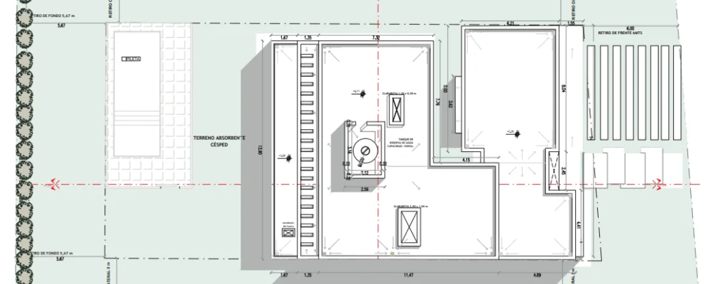 La Casa Jardín se asienta en un lote de 1.066 m², con una superficie cubierta de 271 m² y 135 m² de espacios semicubiertos. En la planta baja, se distribuyen los accesos peatonales y vehiculares, así como los espacios públicos y de servicio. La vivienda se caracteriza por sus amplios ventanales con doble vidrio hermético (DVH) y una textura similar a la madera, que permiten la entrada de luz natural y ofrecen vistas al parque y la piscina. Esta elección de diseño no solo maximiza la luminosidad, sino que también crea una conexión visual constante con el entorno natural.