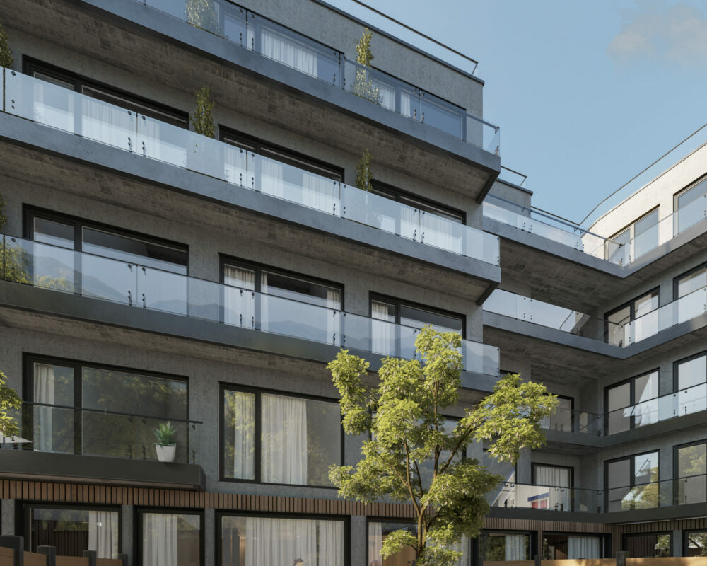 Esta combinación refuerza la imagen de un edificio actual, de líneas claras y volúmenes bien definidos, donde los balcones y las expansiones se suman como planos livianos que otorgan ritmo y profundidad a la fachada.