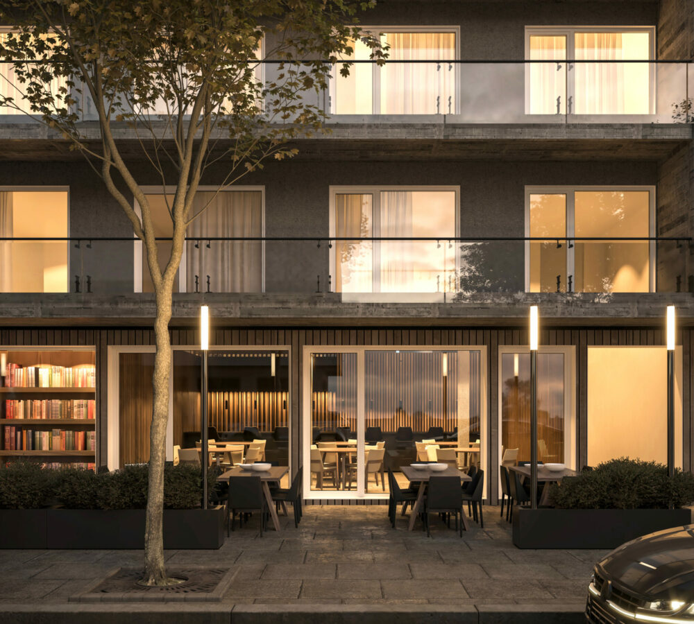 y refuerza el vínculo entre los locales comerciales de la planta baja y la vida urbana cotidiana.