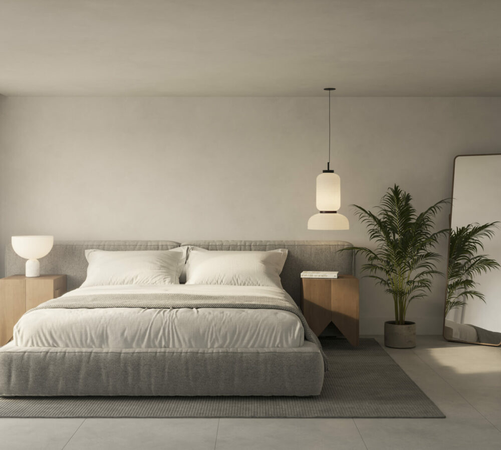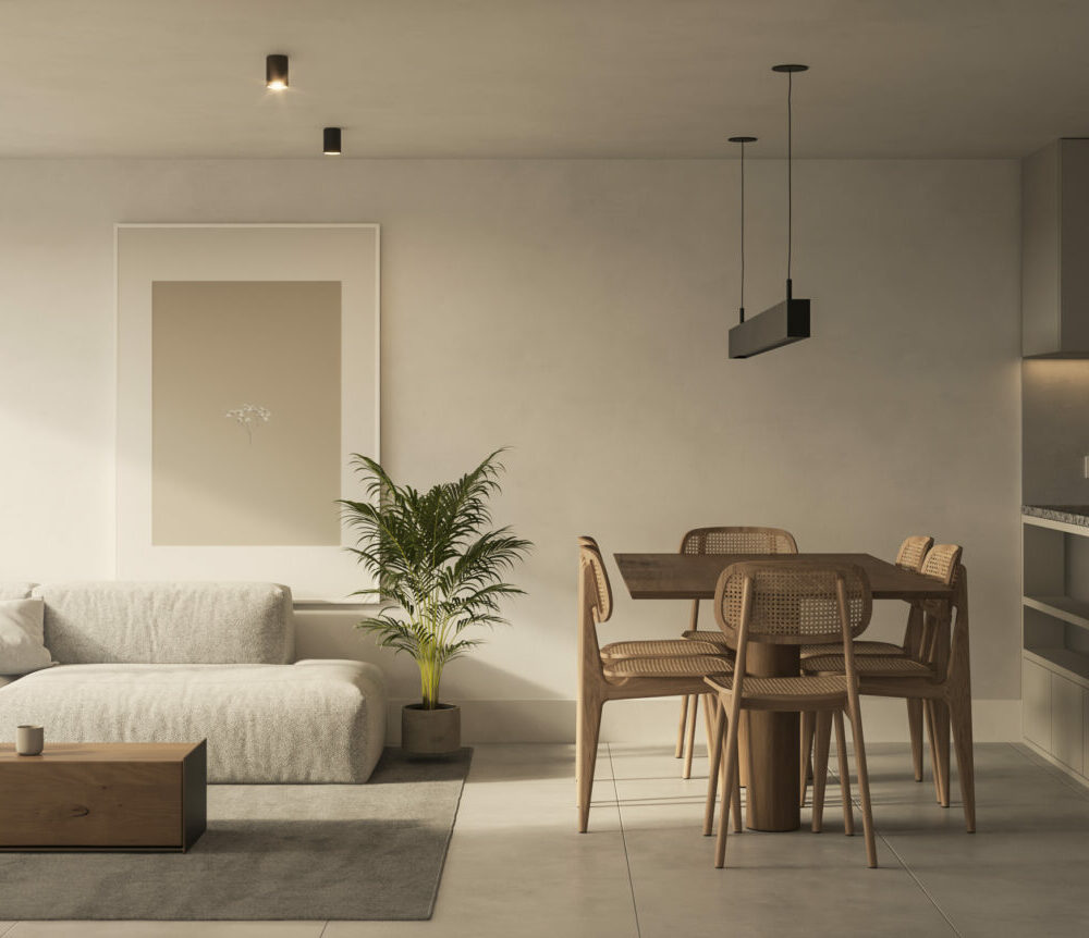 En las áreas comunes y en el interior de las unidades se opta por porcelanatos de gran formato y pisos de porcelanato rectificado en estar-comedor, dormitorios y servicios, consolidando una estética homogénea, de fácil mantenimiento y con una percepción de alta gama.