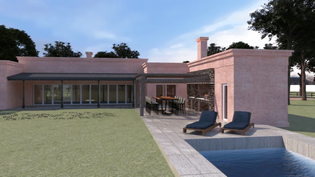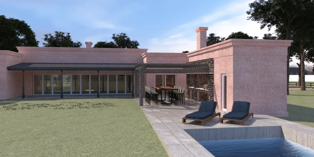 En el ámbito de la vivienda unifamiliar, el Estudio Fernandez Long y Asociados ha llevado a cabo proyectos de gran envergadura, como una casa unifamiliar en El Chamical, San Andres de Giles. La ubicación privilegiada del terreno permitió orientar la casa hacia el norte y crear una galería que abraza el sector exterior, ofreciendo vistas directas a la piscina y proporcionando privacidad entre el área privada y pública de la vivienda.