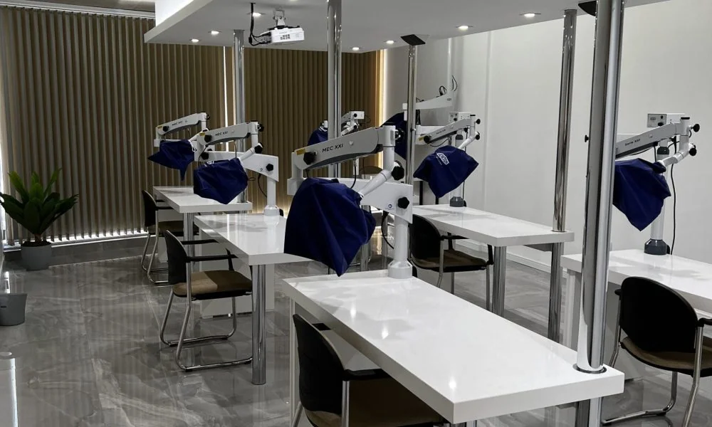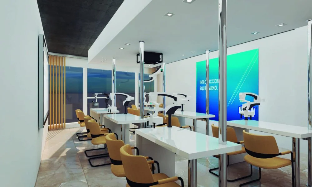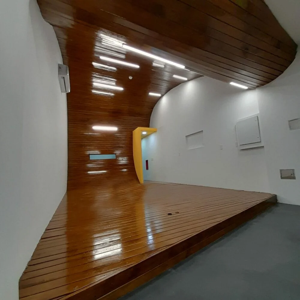 Otro proyecto destacado es la sala de capacitación Microscopios Newton en el Nuevo Quilmes Plaza. El desafío era adaptar un espacio con vistas al patio y al río para que funcione como sala de proyección y capacitación para una empresa de equipos médicos. El estudio propuso una solución creativa al utilizar una pared lateral como pantalla de proyección y mantener la vista del entorno como protagonista durante las capacitaciones orales.