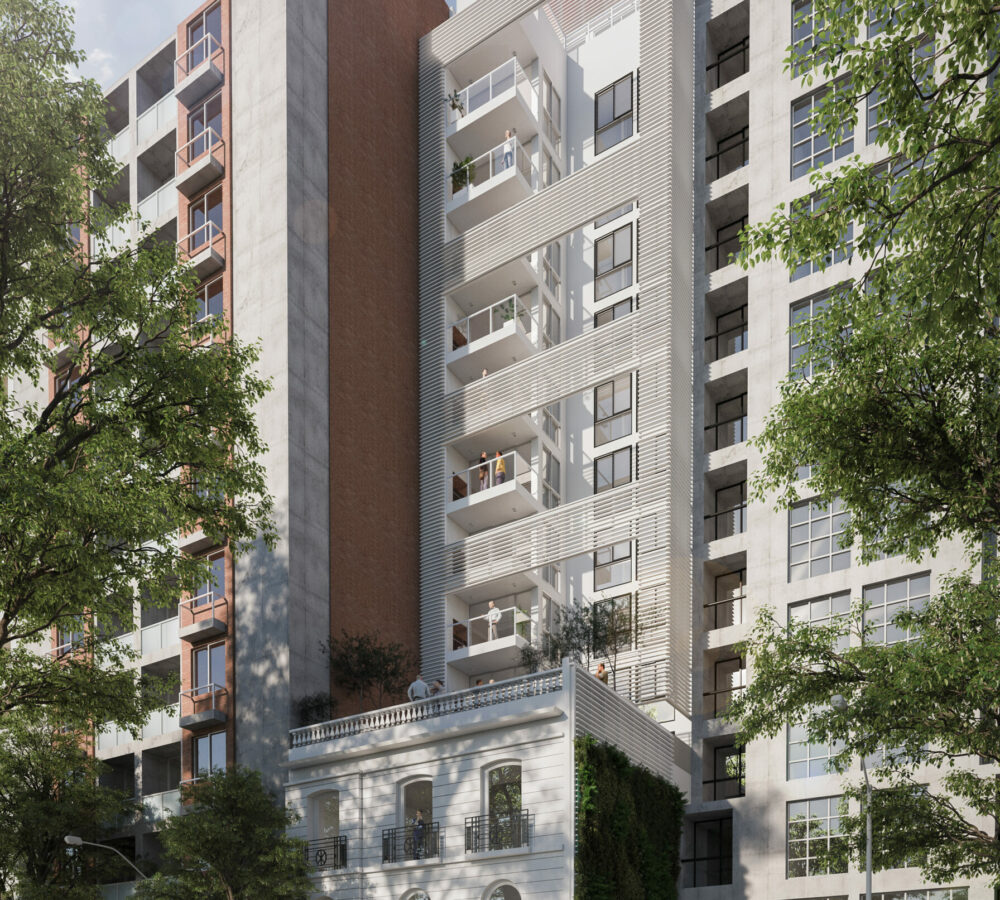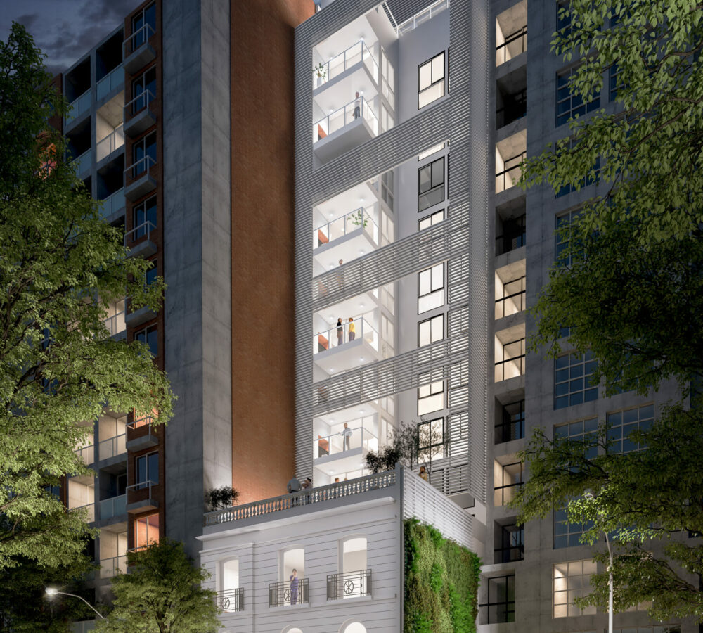 Este proyecto de vivienda colectiva afrontó el reto de intervenir un lote que contiene una casona patrimonial en deterioro. La propuesta buscó preservar y poner en valor lo existente mediante la incorporación de una fachada metálica contemporánea que se dispone como un velo sutil sobre la nueva intervención. La estrategia proyectual combina respeto por el patrimonio con soluciones contemporáneas que dialogan con el tejido urbano circundante.
