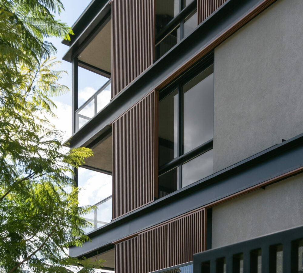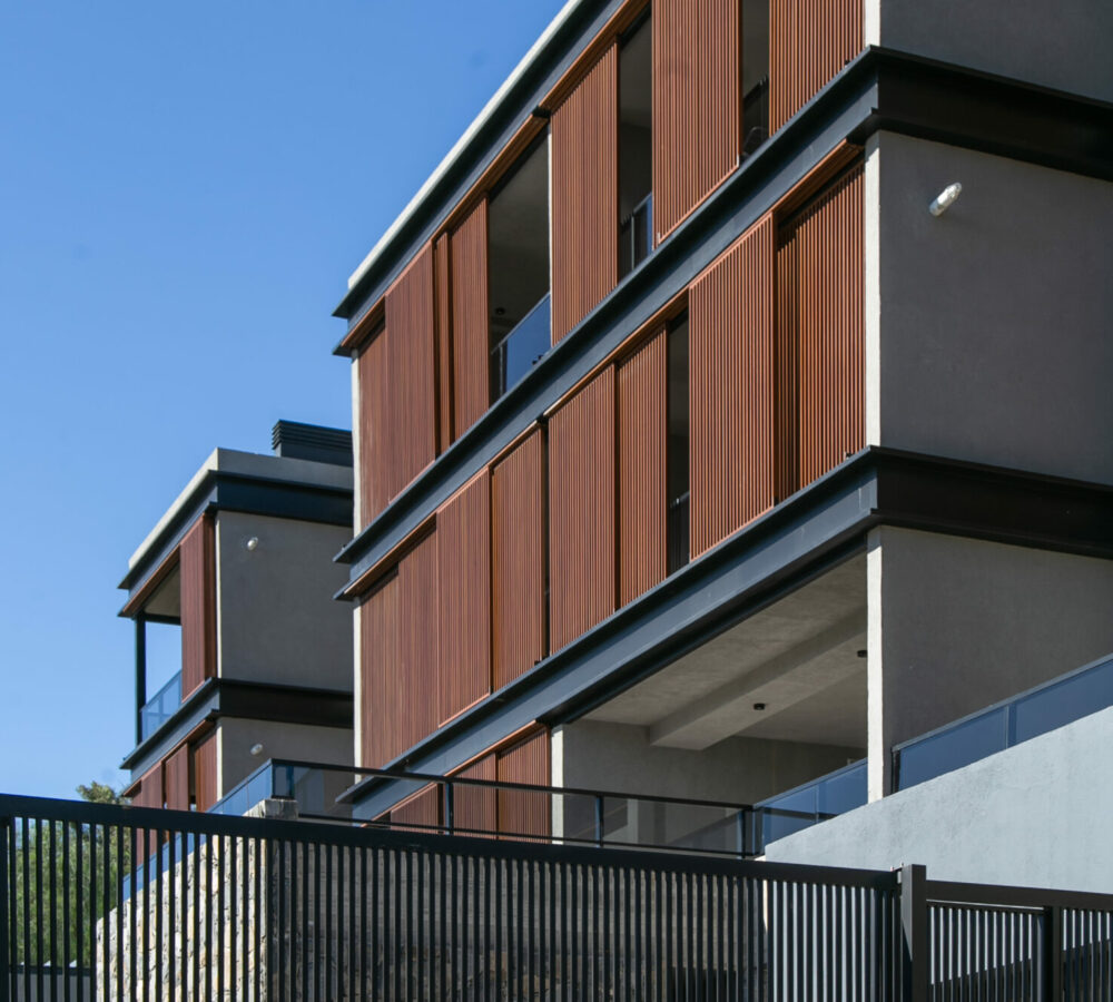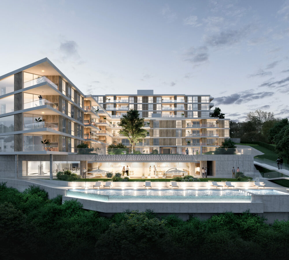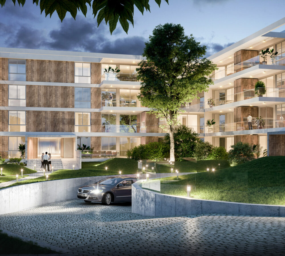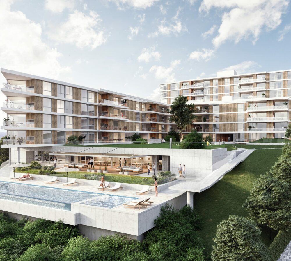 Organizado en planta baja más dos niveles y 14 unidades, este conjunto residencial se asienta en un terreno con fuerte presencia de vegetación y relieve. La propuesta se apoya en un basamento de hormigón y piedra y en elementos metálicos horizontales que contienen parasoles; estos dispositivos regulan la luz y establecen relaciones visuales con el paisaje serrano.