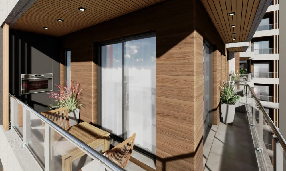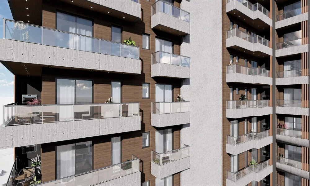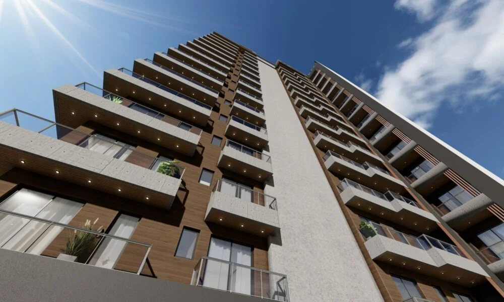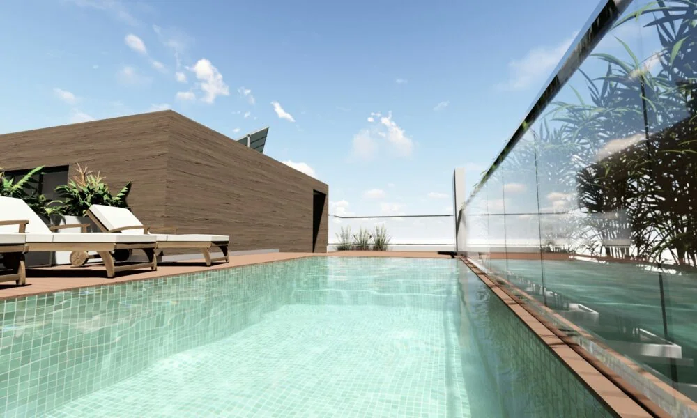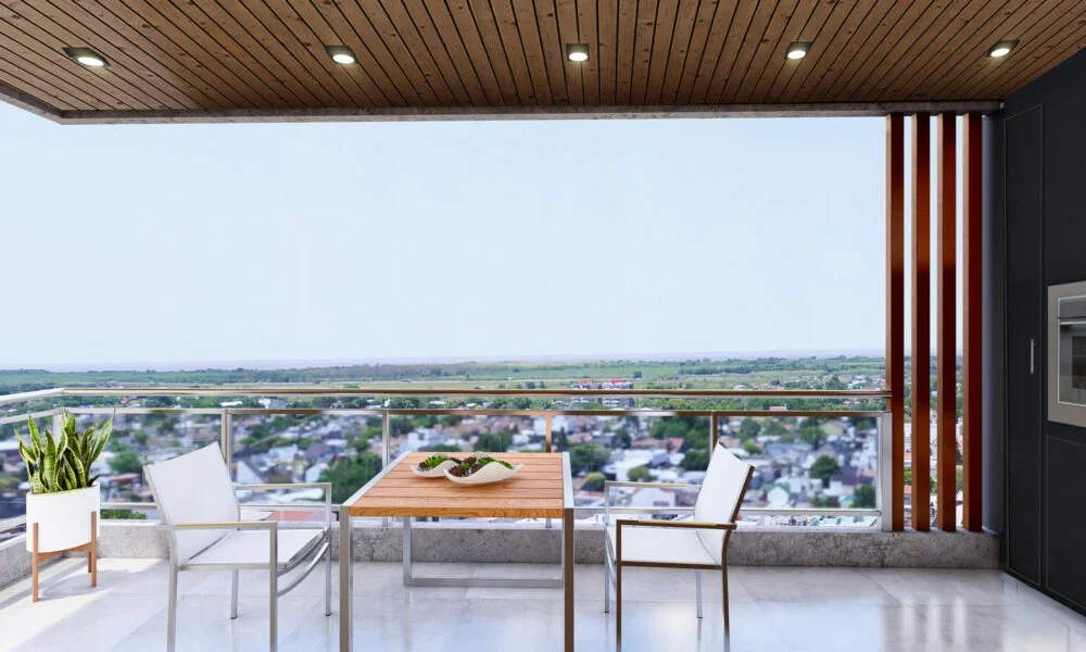 La volumetría en L favorece la iluminación y ventilación natural, permitiendo vistas privilegiadas a la ciudad y al Río de la Plata. En términos de materiales, el uso de hormigón a la vista, porcelanato, carpinterías de aluminio y vidrio refuerzan una estética moderna y de bajo mantenimiento.
